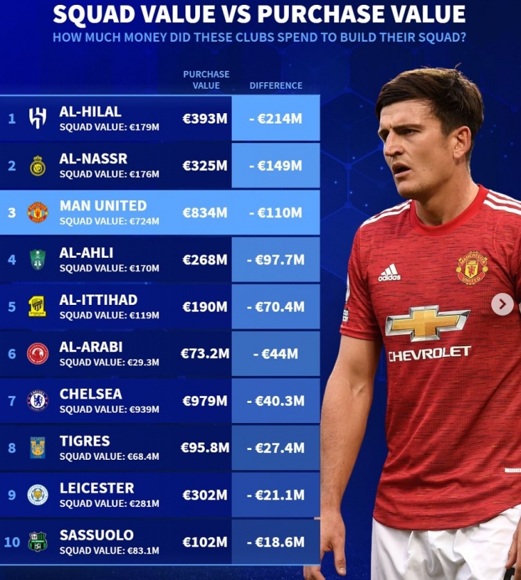 德轉(zhuǎn)當前陣容引援貶值榜:前5名沙特4隊,曼聯(lián)第3&多花1.1億歐