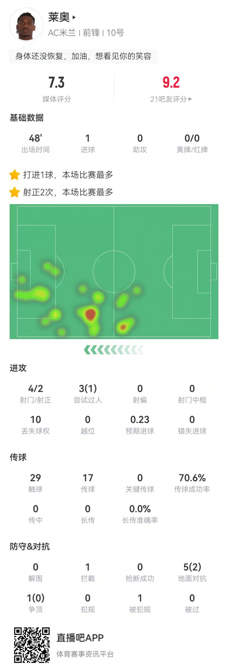 2月9日訊 米蘭在本輪意甲2-0擊敗恩波利,萊奧本場數(shù)據(jù)如下: