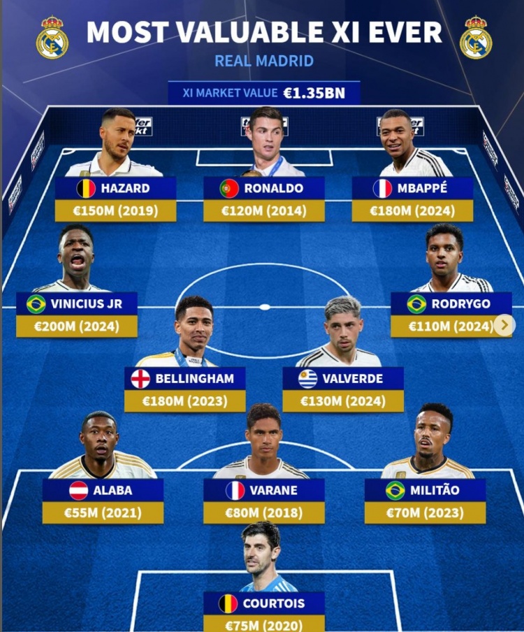 德轉列皇馬隊史身價最貴陣:總身價13.5億歐元