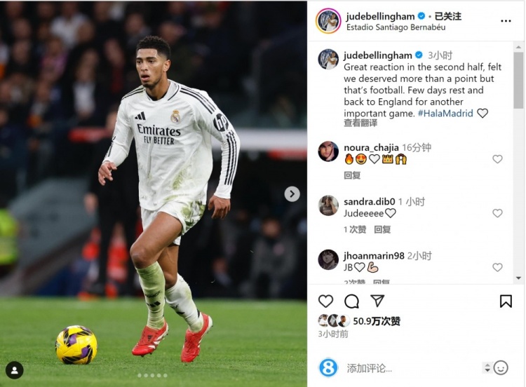 貝林厄姆曬出自己的比賽照片,配文:“球隊(duì)下半場的反應(yīng)很好,我覺得我們理應(yīng)拿到更多的積分,但這就是足球?!?/p>