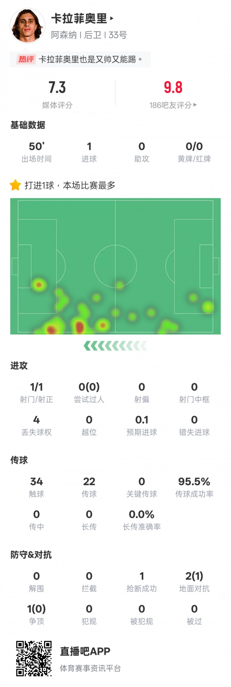 1月26日訊 英超第23輪,阿森納客戰(zhàn)狼隊,卡拉菲奧里替補出戰(zhàn),打進制勝進球,傳球成功率達到95.5%,評分7.3。