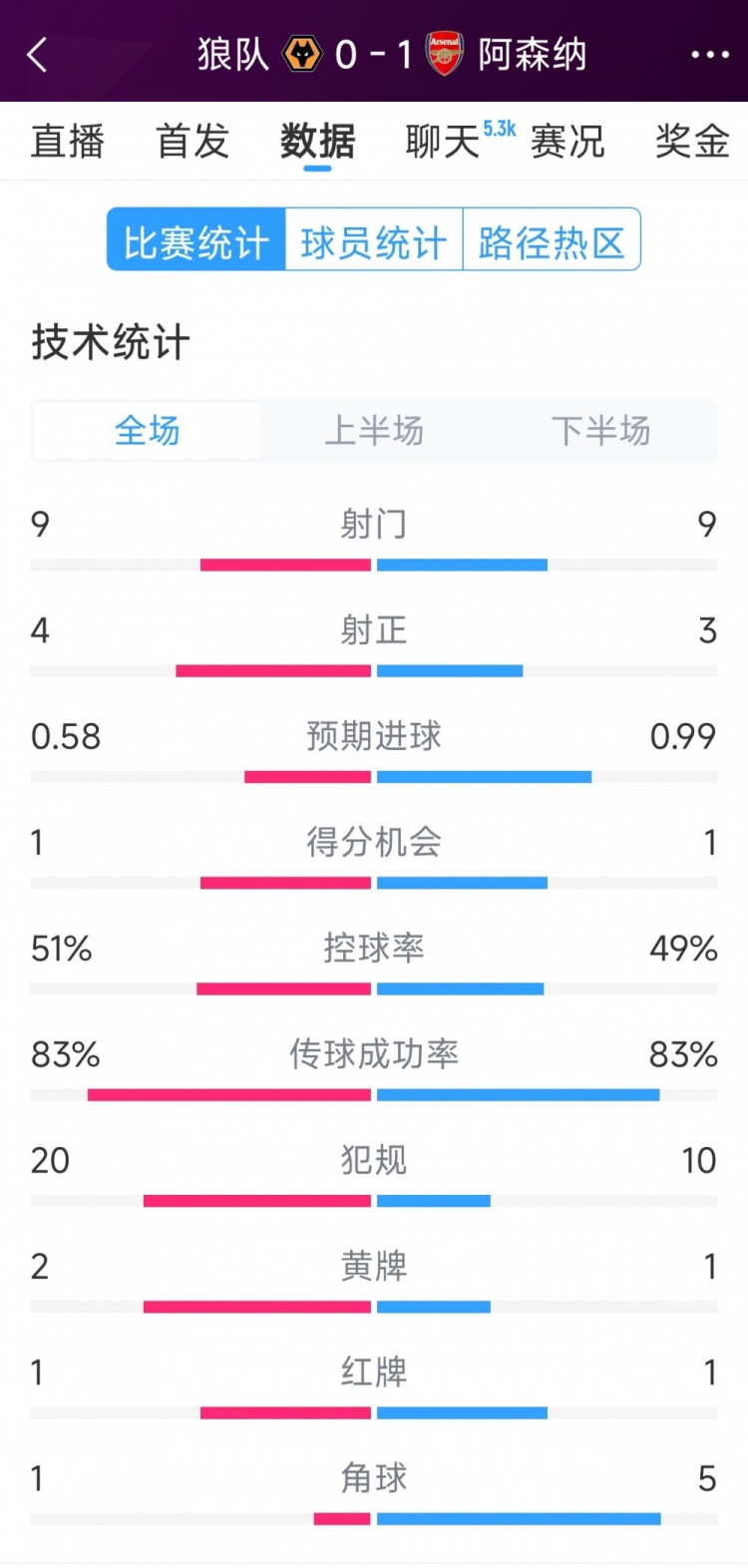 險(xiǎn)勝!阿森納1-0狼隊(duì)全場數(shù)據(jù):射門9-9,射正3-4,紅牌1-1