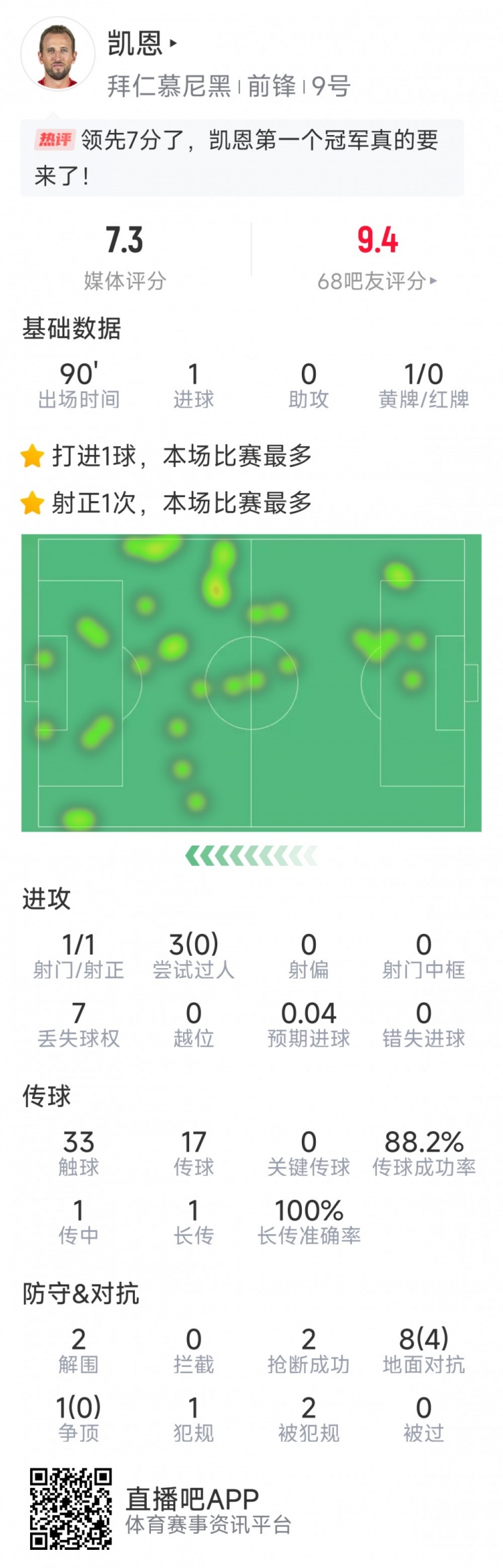 1月26日訊 在本輪德甲,拜仁2-1擊敗弗賴堡,凱恩破門,以下為他在本場數(shù)據(jù):