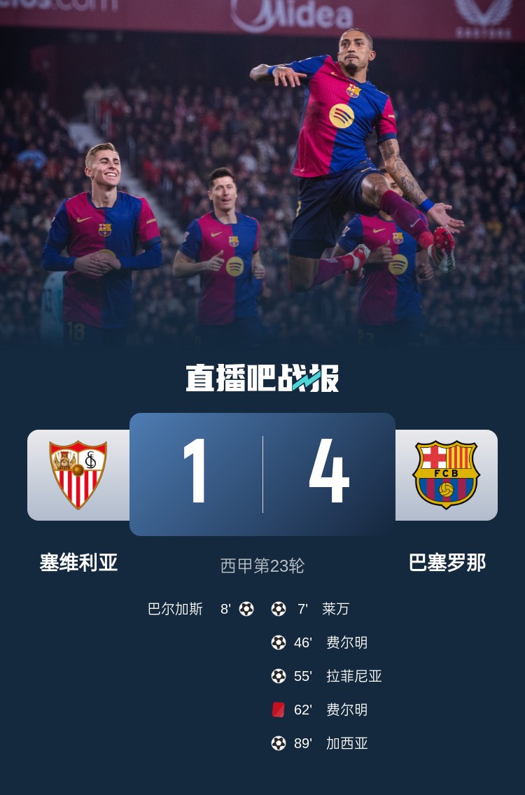 西甲第23輪,巴薩4-1塞維,距離榜首僅差2分。上半場,萊萬墊射破門,巴爾加斯1分鐘后迅速扳平,阿勞霍被鏟傷退;下半場,費爾明頭球,拉菲尼亞再下一城,費爾明紅牌,補時前埃里克-加西亞再進一球。