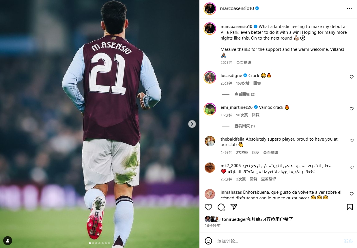 他也在賽后通過社媒曬出自己的比賽照,并配文:“在維拉公園的首次亮相真是太棒了,取得勝利讓這感覺更好了!期待未來能有更多這樣的夜晚。晉級下一輪!??????????非常感謝你們的支持和熱烈歡迎,維拉球迷們!”