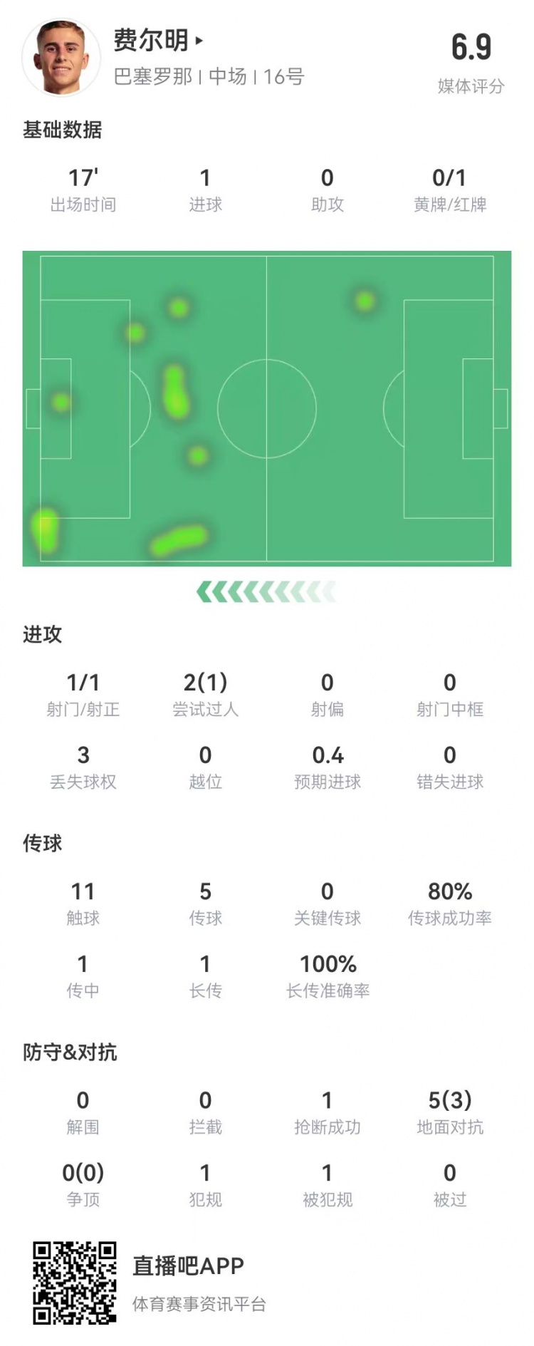 費爾明本場數(shù)據(jù):替補17分鐘1球+1紅牌 5對抗3成功 獲評6.9分