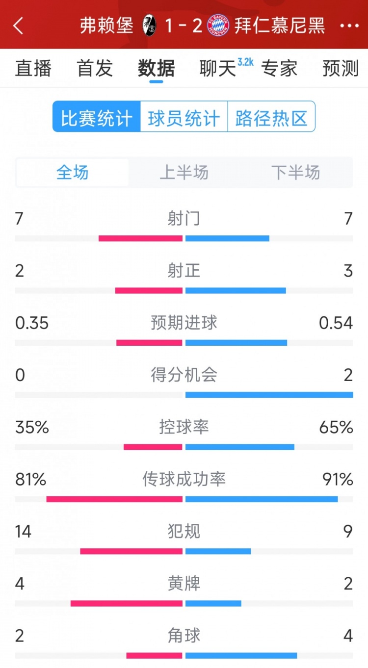 拜仁2-1弗賴堡全場數(shù)據(jù):射門7-7,射正3-2,得分機(jī)會2-0