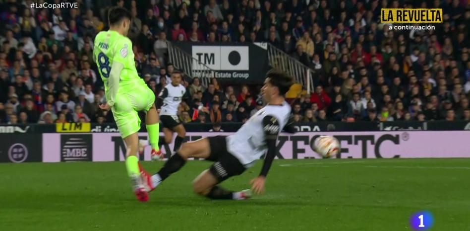 國王杯1/4決賽,巴薩5-0大勝瓦倫西亞,瓦倫球員雨果-吉利亞蒙亮鞋釘飛鏟佩德里,佩德里痛苦倒地,但裁判連黃牌都沒出。