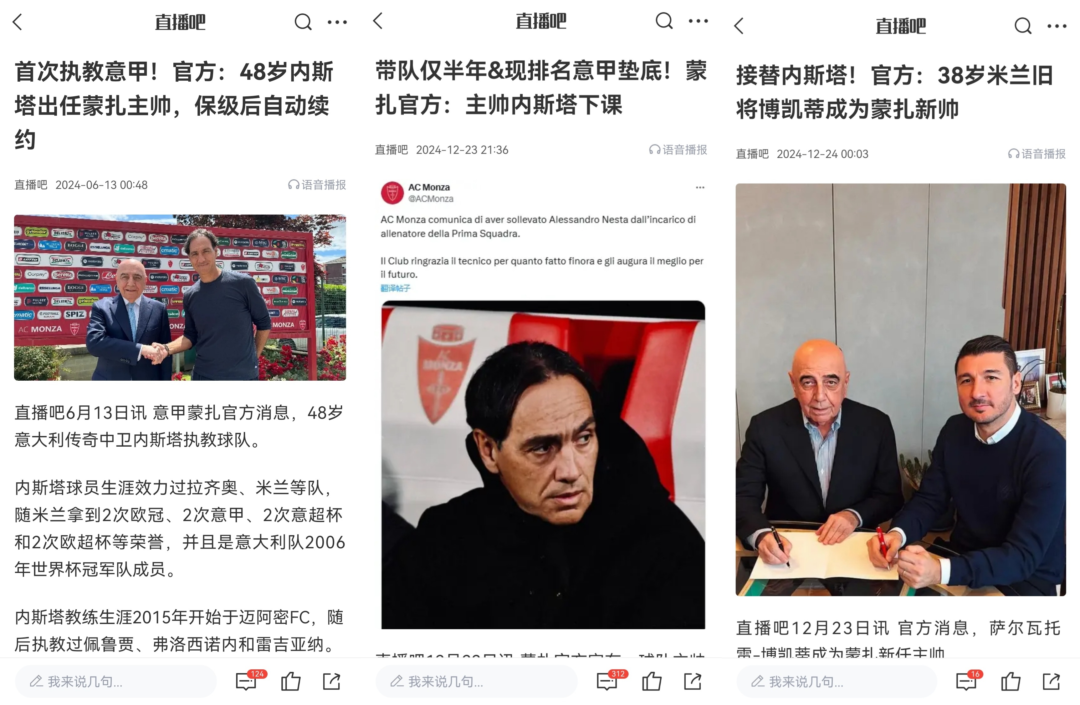 內(nèi)斯塔上一次執(zhí)教蒙扎持續(xù)了不到半年,帶隊(duì)20場(chǎng)比賽收獲3勝7平10負(fù),其中意甲1勝7平9負(fù)。