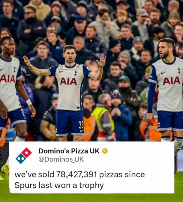 自熱刺上次贏得獎(jiǎng)杯以來,我們已經(jīng)售出了78427391個(gè)披薩~