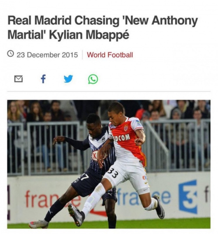 考古報(bào)道:2015年12月,皇馬追逐“新馬夏爾”——基利安-姆巴佩