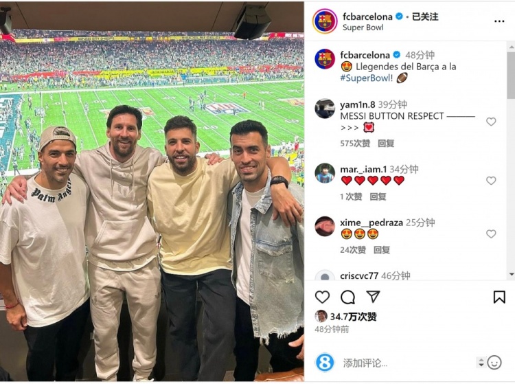 梅西、蘇亞雷斯、阿爾巴、布斯克茨一起觀看了比賽,巴薩社媒曬出四人的合照,配文:“巴薩傳奇在超級碗。”