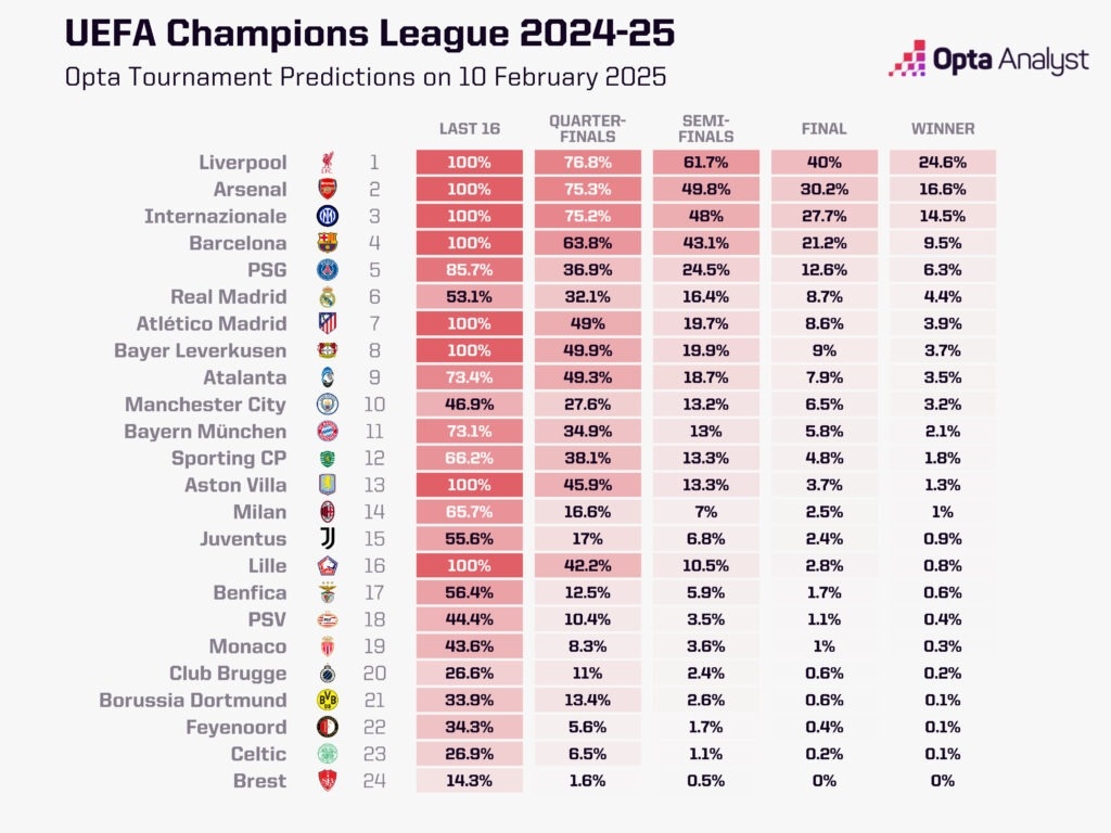 Opta大數(shù)據(jù)預測歐冠奪冠概率:
