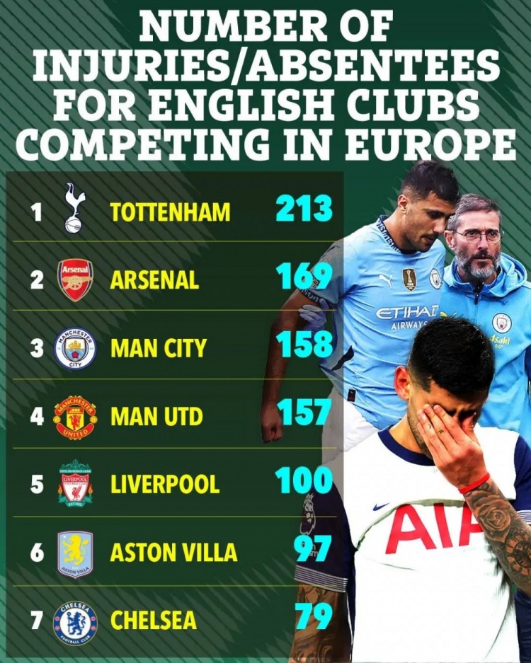 2月11日訊 《太陽報》報道,根據(jù)統(tǒng)計,熱刺是本賽季傷病問題最嚴(yán)重的英超俱樂部。